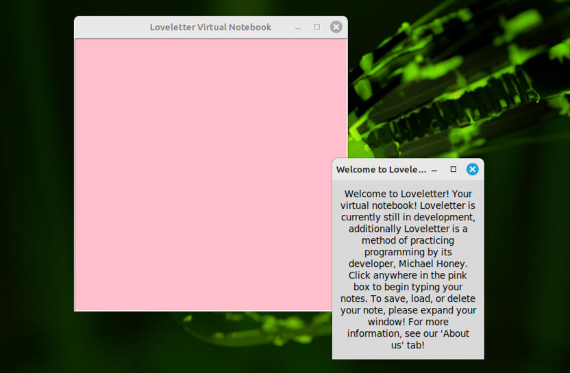 Created using Python and Tkinter on Linux Mint Cinnamon, Loveletter is a loveletter to early internet and its aesthetic.
